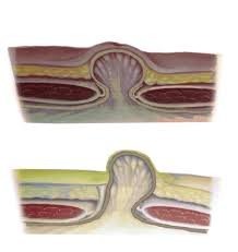 - kúp alakú, cseresznyényi (ritkán annál nagyobb) előemelkedés a köldökben, amely a hasizom megfeszítésére (köhögés teszt) nagyobb lesz