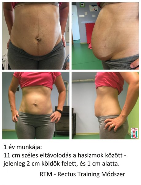 Klárival 1 éve dolgozunk együtt. 2. gyermeke születése után 5 hónappal jött vissza hozzám, nagyobb fia ekkor 3 éves volt. Palpális vizsgálattal ekkor 11 cm széles, teljes hosszúságú eltávolodást éreztem egyenes hasizmai között! 90 cm-es haskörfogatot mértünk.